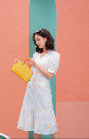 Example: White cotton dress with a light belt, beige ballerinas, leather shoulder bag and a delicate silver bracelet.